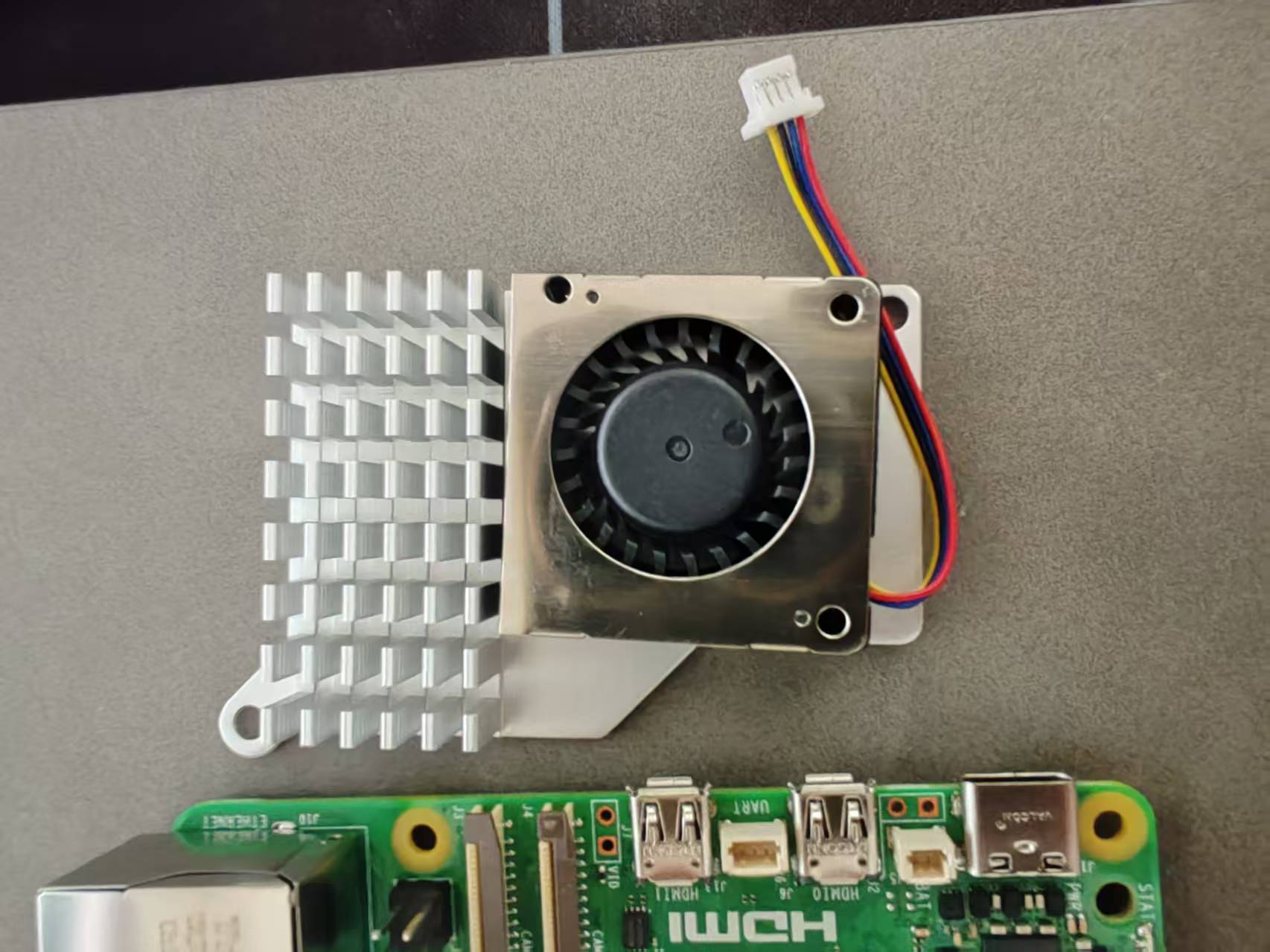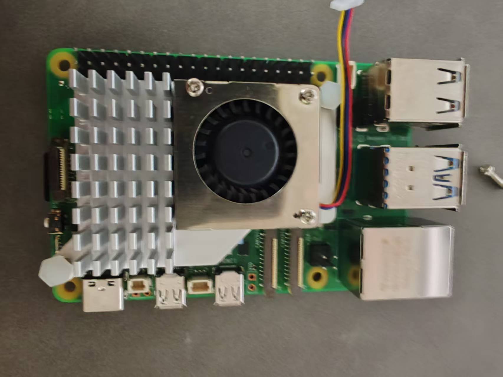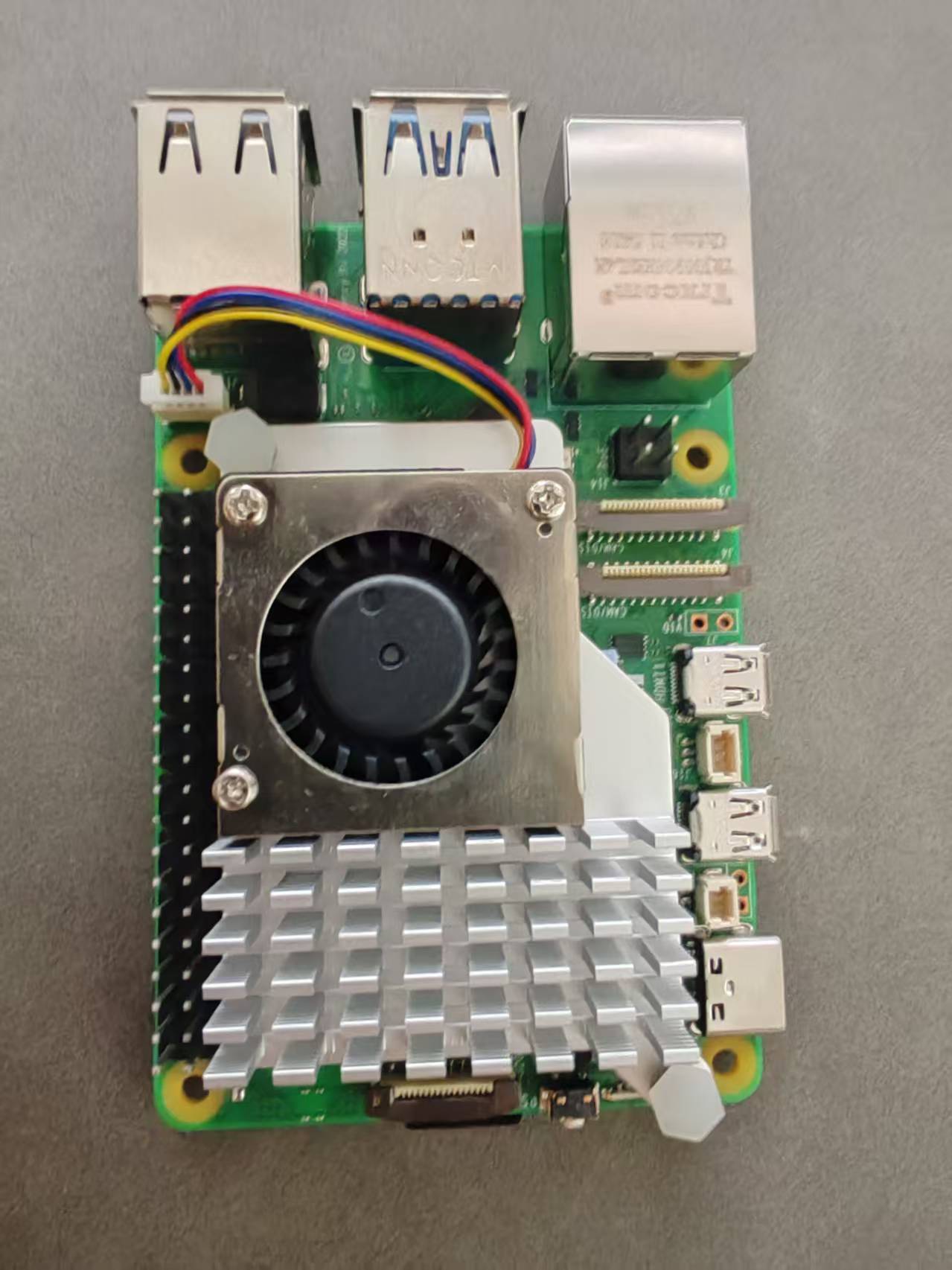 如果你买的是标准礼包,没有太多附加配件和扩展板的,那其实没什么东西好装,插上电源,插上hdmi显示器就可以点亮了,但笔者购买的是带散热器的版本,所以还要装一个小风扇。