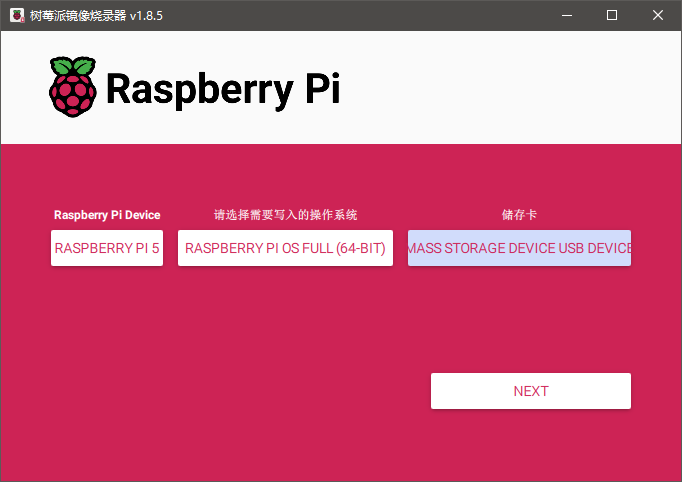 烧录工具会让你选择你要运行的设备,你要烧录的操作系统以及目标存储卡,笔者这里分别选择pi5,full版本树莓派OS以及目标SD卡。
